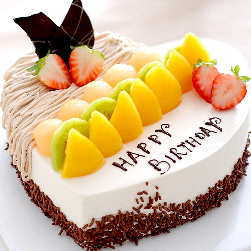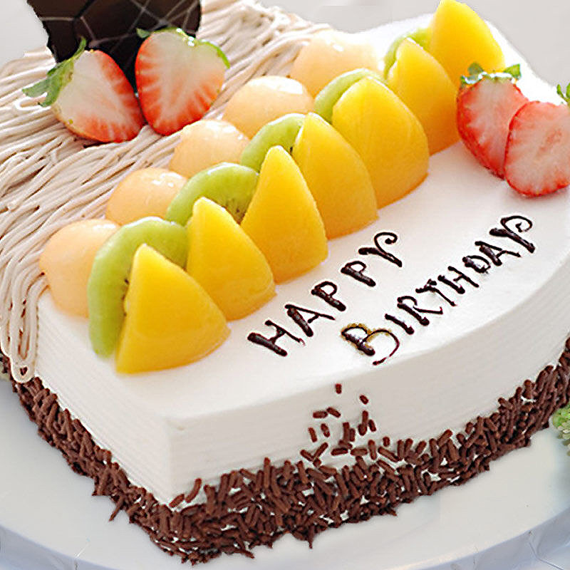蛋糕材料: 奶油水果巧克力“爱心形”蛋糕,表面时令水果巧克力装饰。