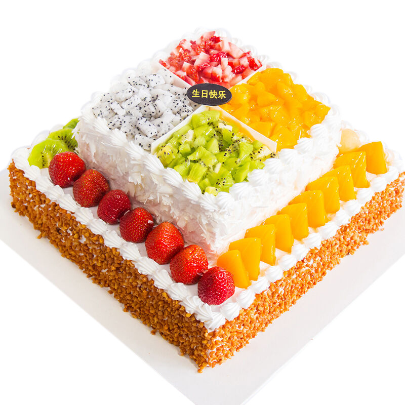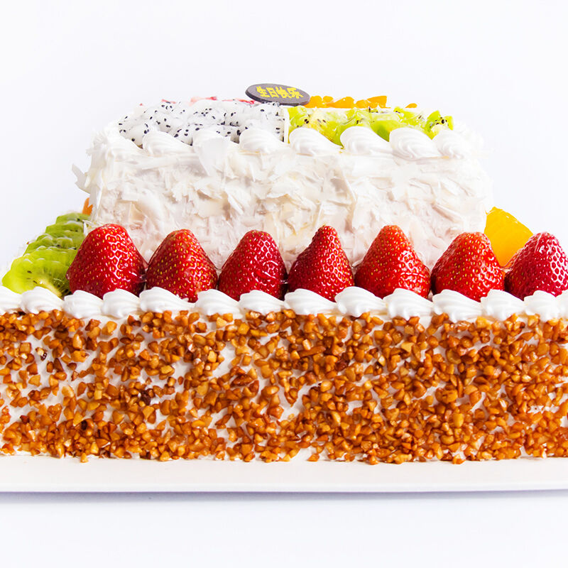 蛋糕材料: 双层奶油水果蛋糕,时令水果装饰,花生脆搭配