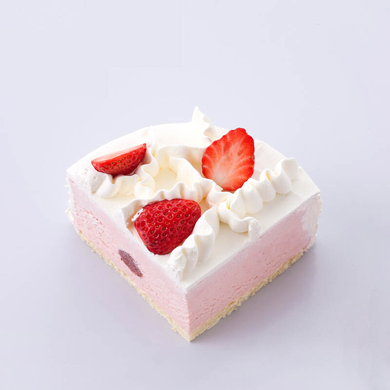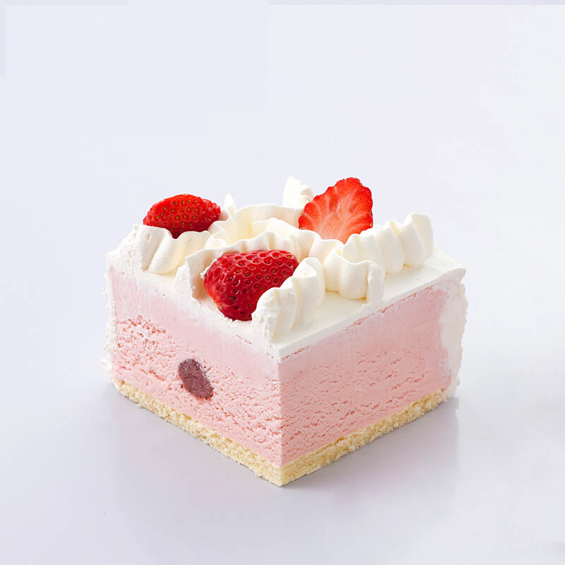 蛋糕材料: 草莓冰淇淋蛋糕,外层法国淡奶油,中间层草莓味冰淇淋,内层原味蛋糕,草莓装饰。