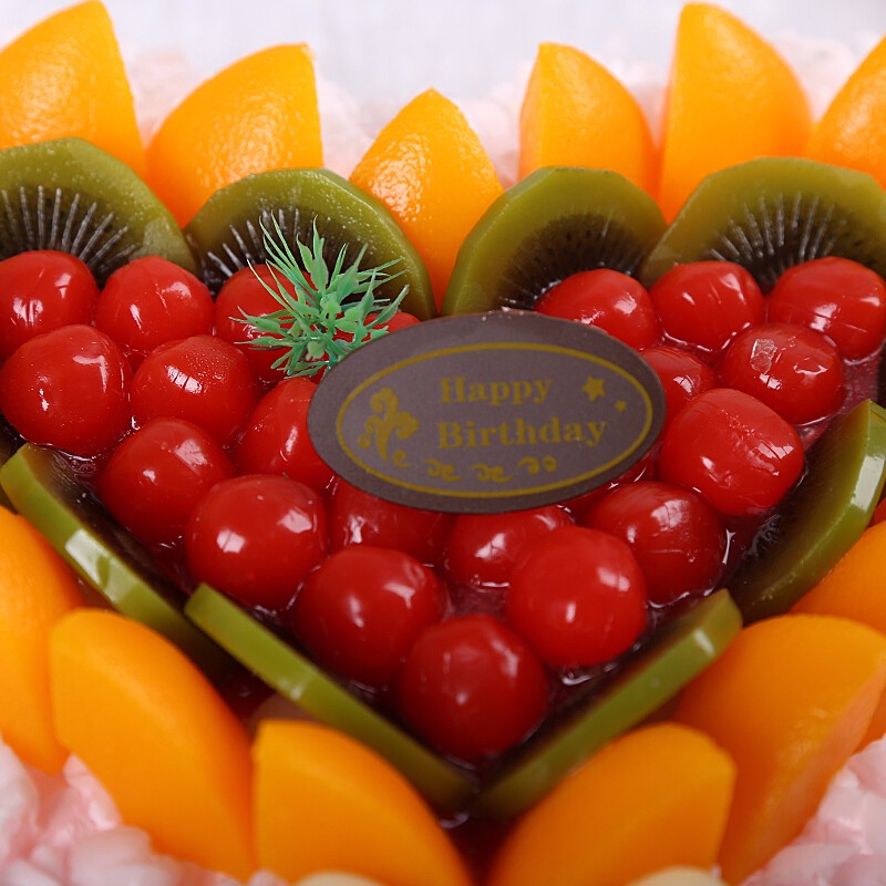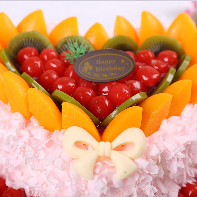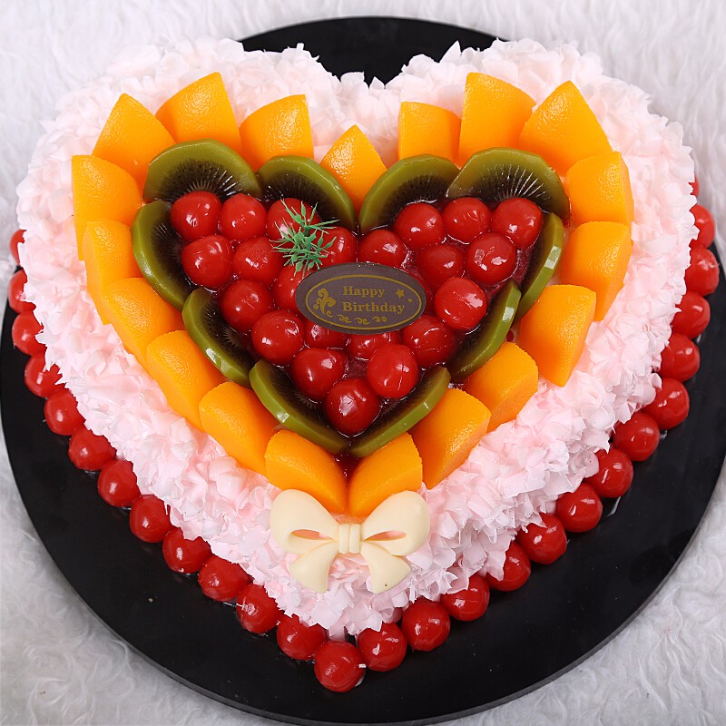蛋糕材料: 鲜奶水果蛋糕,一层一层时令新鲜水果围成心形,粉色巧克力碎装饰。