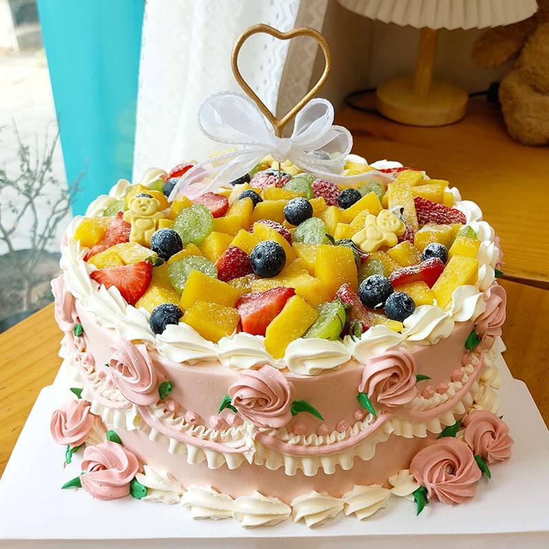 蛋糕材料: 圆形奶油水果蛋糕,火龙果,芒果,蓝莓(根据当季时令水果搭配)铺面,水果外围白色奶油钩花。蛋糕侧面粉色裱花。