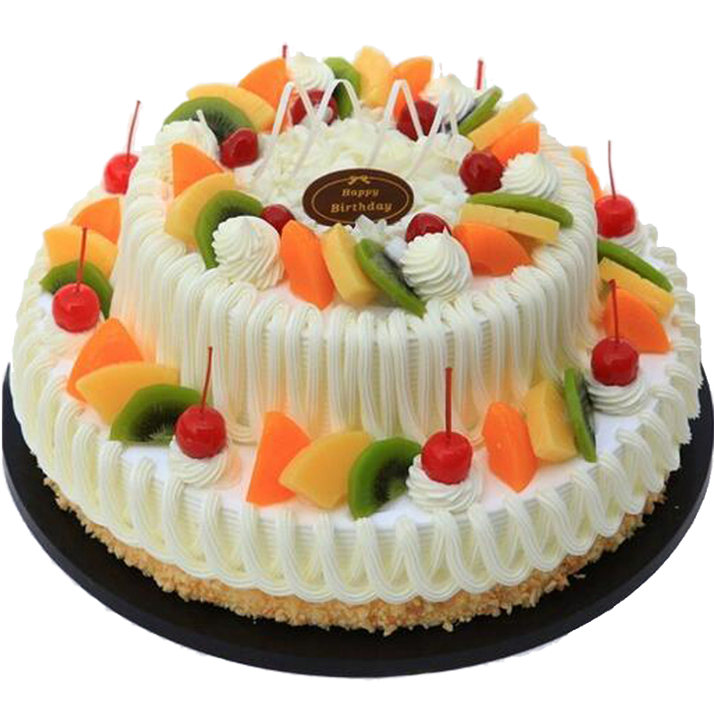 蛋糕材料:双层鲜奶蛋糕,表面新鲜时令水果环绕,侧面奶油勾丝装饰。