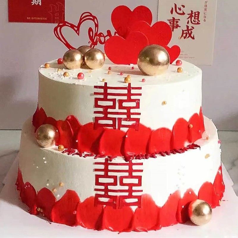 蛋糕材料: 双层新鲜奶油蛋糕,红色围边,喜字等喜庆插件装饰。