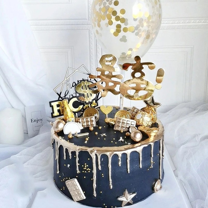 蛋糕材料: 网红圆形奶油男士暴富创意蛋糕,搭配暴富等黑色,金色插件,气球装饰。