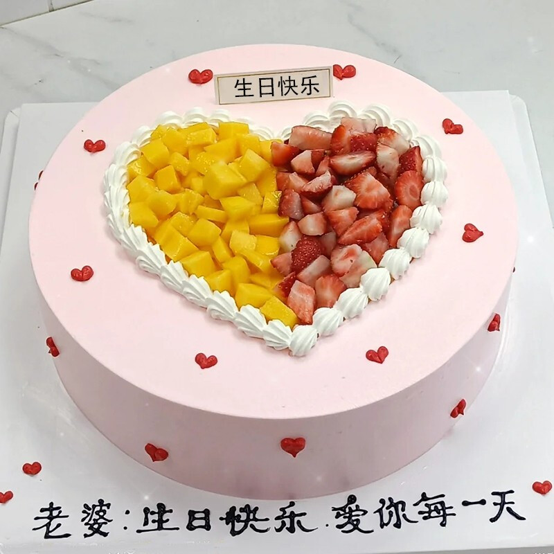 蛋糕材料: 圆形鲜奶水果蛋糕,中间2种时令水果分半围成心形,奶油裱花。