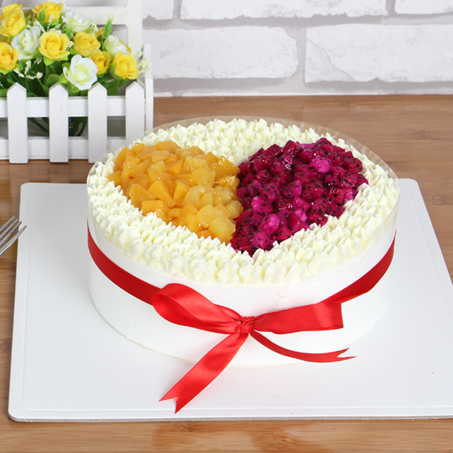 蛋糕材料: 圆形鲜奶蛋糕,中间芒果、火龙果分半围成心形,奶油裱花,红色缎带蝴蝶结。