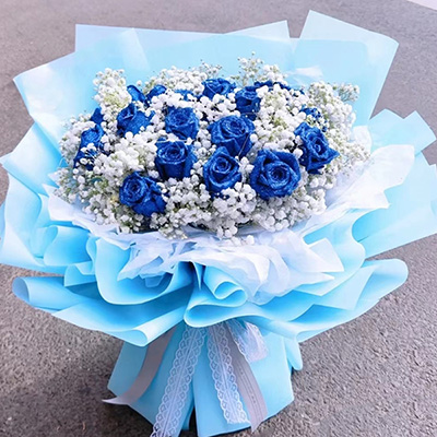 【幸福起点】精选19朵蓝色妖姬,1条彩灯,白色满天星丰满间插。