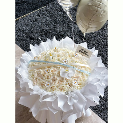 【笑颜】52支白荔枝玫瑰,1朵白色蝴蝶兰,1支白色郁金香,7支干花紫罗兰,2个气球,1条丝带装饰花面。白色纸多层包装。