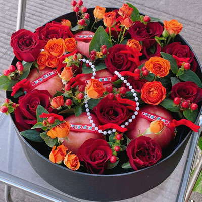 【幸福平安】6颗苹果,2朵香槟玫瑰,3支多头橙色小玫瑰,4支洋桔梗,搭配小雏菊(或白色满天星),尤加利叶装饰。