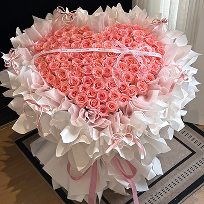 【月下听花】粉荔枝玫瑰、白荔枝玫瑰共99朵,一半粉色、一半白色组成心形造型,搭配粉色丝带蝴蝶结装饰花面。