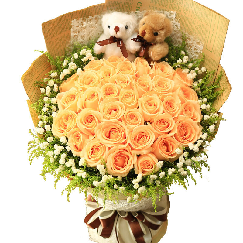 【致美丽的你】精选33朵香槟玫瑰,2只可爱公仔,外围满天星、黄莺配花点缀。