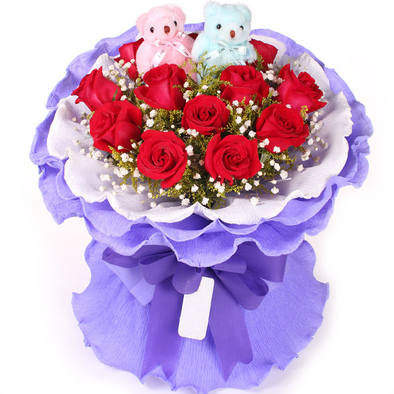 【眷念你】11支红玫瑰,满天星、黄莺间插,随机赠送两只可爱的小公仔。