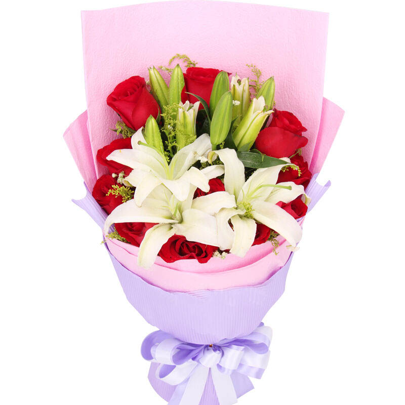 【唯你最爱】11朵红玫瑰,3支多头白色香水百合,黄莺点缀。