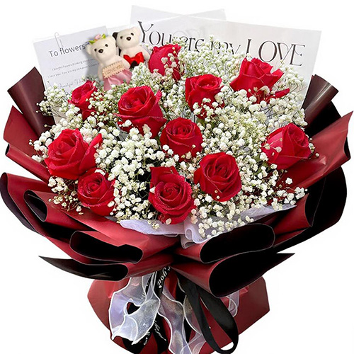 【最浪漫】精选11朵红玫瑰,2支可爱小公仔(款式随机),搭配满天星装饰。
