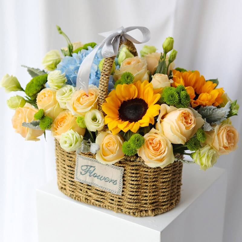 【清酒桃花】精选2支蓝色绣球花,2支向日葵,16朵粉玫瑰,1支白色多头百合,搭配洋桔梗,粉色满天星,尤加利叶装饰,粉色蝴蝶结。