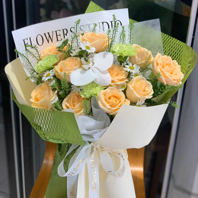 【摘明月】10枝香槟玫瑰,1朵白色蝴蝶兰,3支绿色康乃馨,搭配绿铃草,白色小雏菊丰满间插