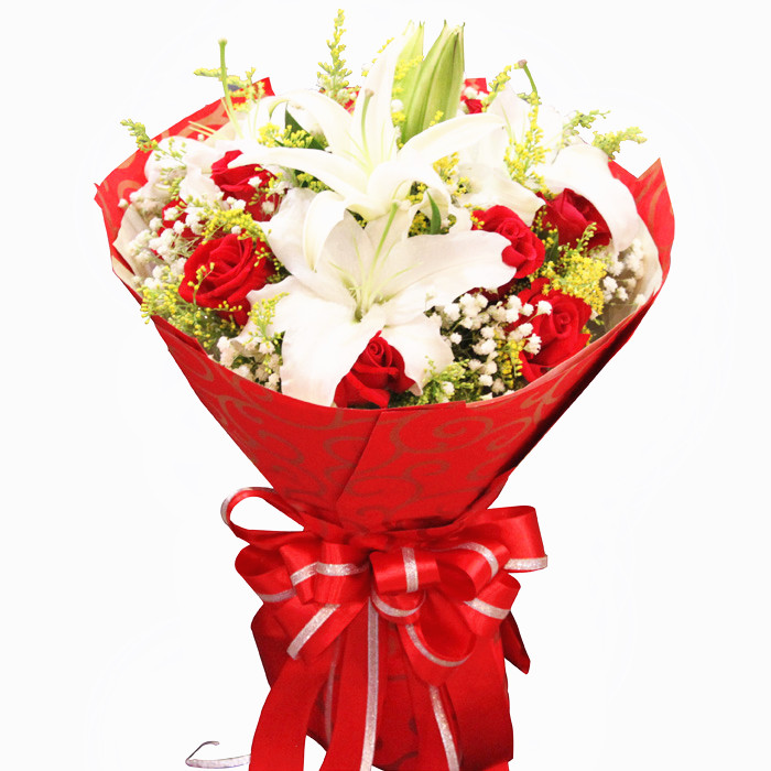 【绝代风华】11朵红玫瑰,2枝多头香水百合,黄英、满天星点缀。