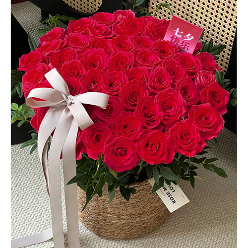 【爱你三千遍】精选52朵卡罗拉红玫瑰,搭配九星叶、尤加利叶,表面浅色蝴蝶结缎带装饰。