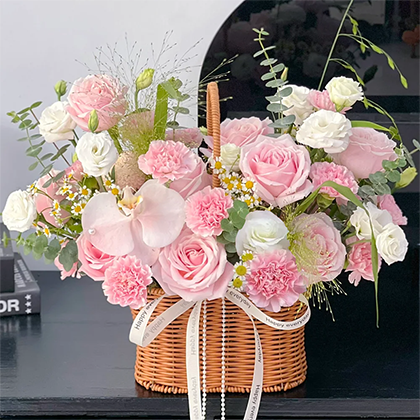 【春山浅黛】精选21朵粉色康乃馨和粉玫瑰混搭(其中粉玫瑰10朵,粉色康乃馨11朵),1朵蝴蝶兰,5支浅色多头洋桔梗,搭配洋甘菊、喷泉草、尤加利叶等绿叶装饰。