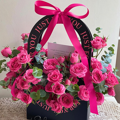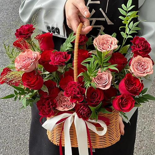 【朱颜醉】精选21朵红色康乃馨、红玫瑰混搭,5支卡布奇诺玫瑰(卡布奇诺随季节温度变化颜色会发生改变,为保证效果,可用戴安娜粉玫瑰代替),搭配多头红康、九星叶(细叶尤加利)装饰。