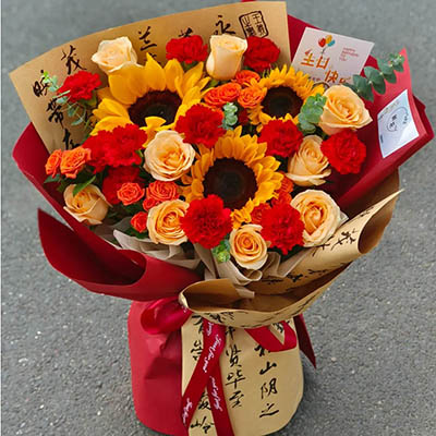【金辉满载】精选3枝向日葵,19朵玫瑰康乃馨混搭(红玫瑰和红色康乃馨为主,金辉玫瑰、香槟玫瑰),5枝多头橙色泡泡,搭配尤加利叶装饰。