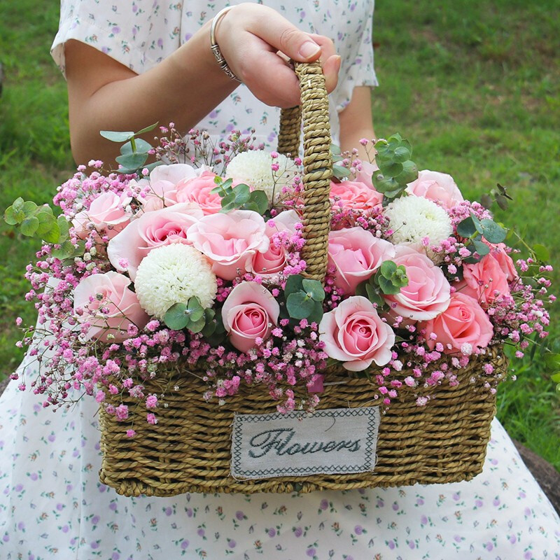【花篮里的春天】 精选8枝香槟玫瑰,2枝向日葵,1朵粉色康乃馨,3支多头橙色泡泡,4支浅色多头洋桔梗,搭配洋甘菊、喷泉草、尤加利叶装饰。