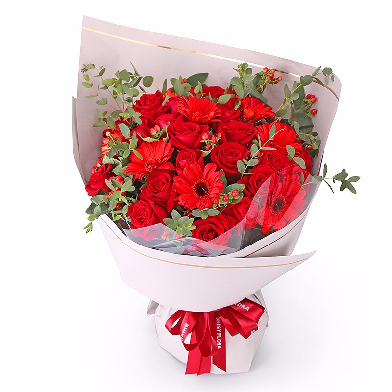 • 【最爱你】精选33朵红玫瑰,6支红色太阳花,火龙珠、尤加利尖叶装饰。