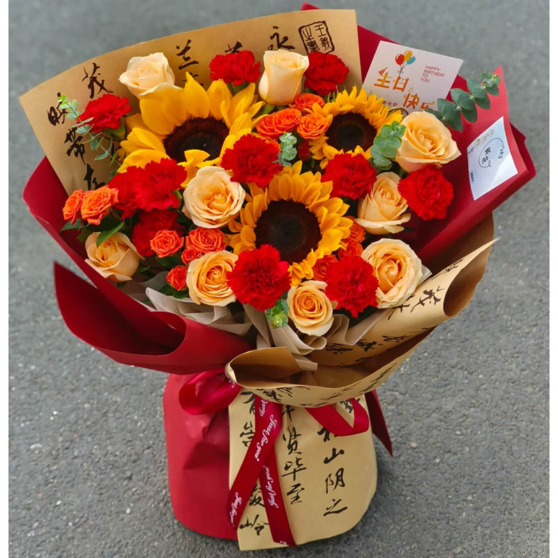 花 材:3枝精品向日葵,19朵红色康乃馨和香槟玫瑰混搭(红色康乃馨10枝,香槟玫瑰9枝),3枝多头橙色泡泡,搭配尤加利叶装饰。