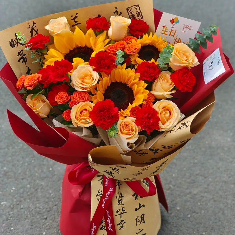 花材: 3枝精品向日葵,19朵红色康乃馨和香槟玫瑰混搭(红色康乃馨10枝,香槟玫瑰9枝),3枝多头橙色泡泡,搭配尤加利叶装饰。