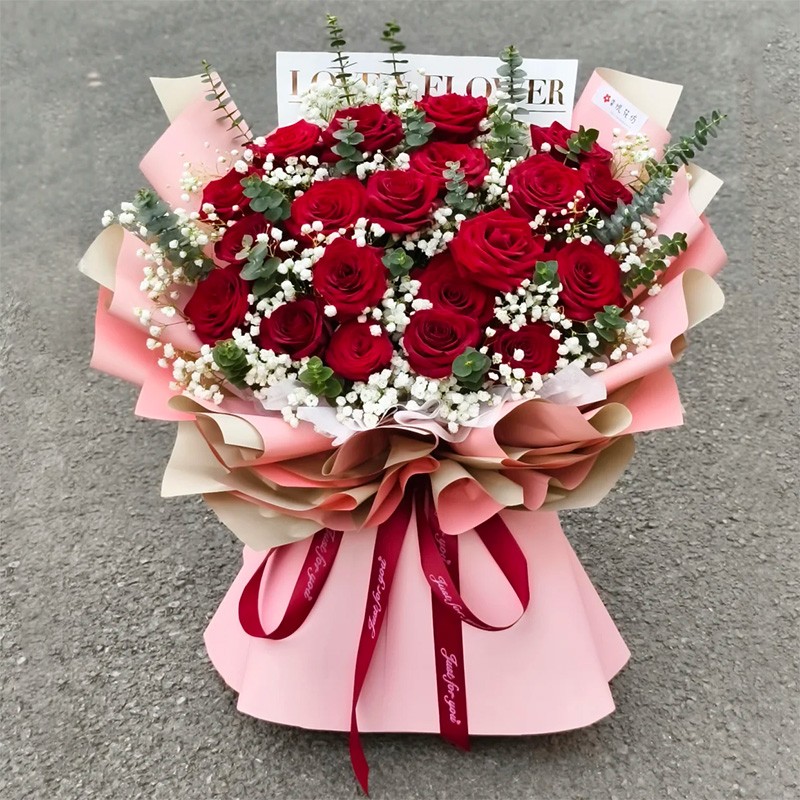 花 材:精选20枝红玫瑰,搭配尤加利叶、白色满天星装饰。