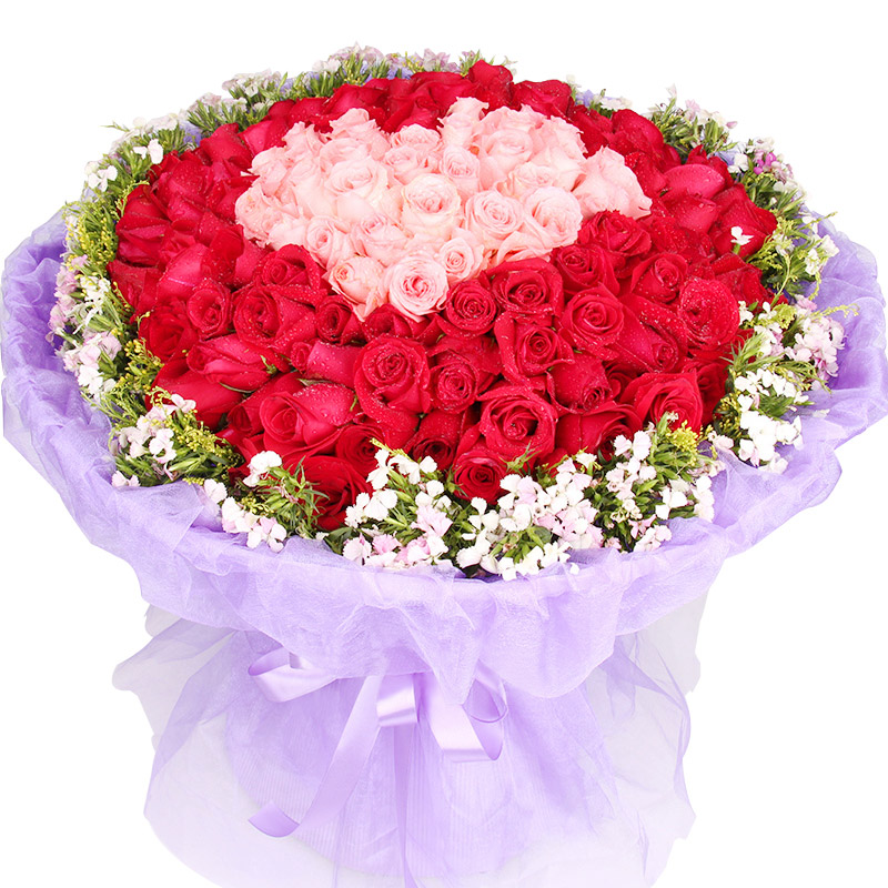 花材: 99朵玫瑰(33朵精品粉玫瑰,66朵精品红玫瑰),搭配黄莺、相思梅