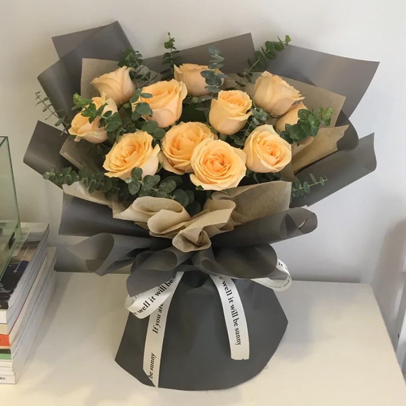 花材: 精选11枝香槟玫瑰,尤加利叶装饰。