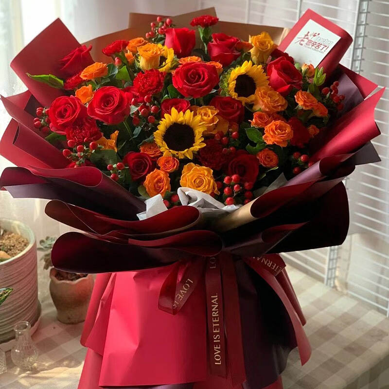 花 材:精选3朵向日葵,19朵红色玫瑰与红色康乃馨混搭,5支多头橙色泡泡,搭配红豆、尤加利叶装饰。