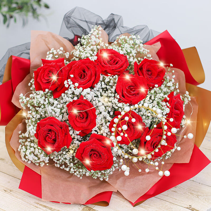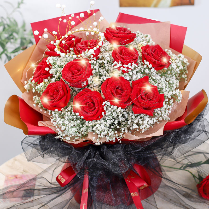 花 材:11枝红玫瑰,1个珍珠皇冠(款式随机),1条串灯,搭配白色满天星。