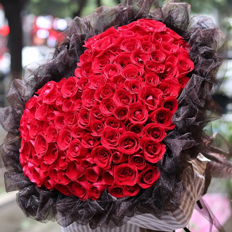 花 材:99朵红玫瑰,心形造型。黑色网纱外包。