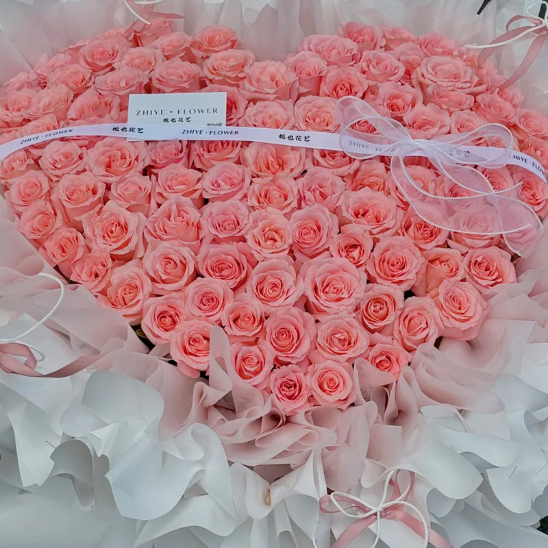 花材: 99朵戴安娜粉玫瑰,心形造型,搭配1条白色英文缎带装饰花面。