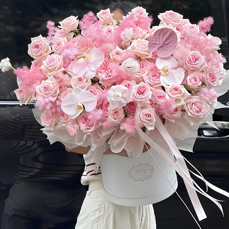 包 装:白色纸叠角内衬,粉色花结,白色抱抱桶(抱抱桶和配饰等具体以当地实物为准)