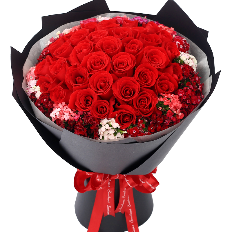 花 材:33支精品红玫瑰,外围搭配适量红色、粉色、白色石竹梅。