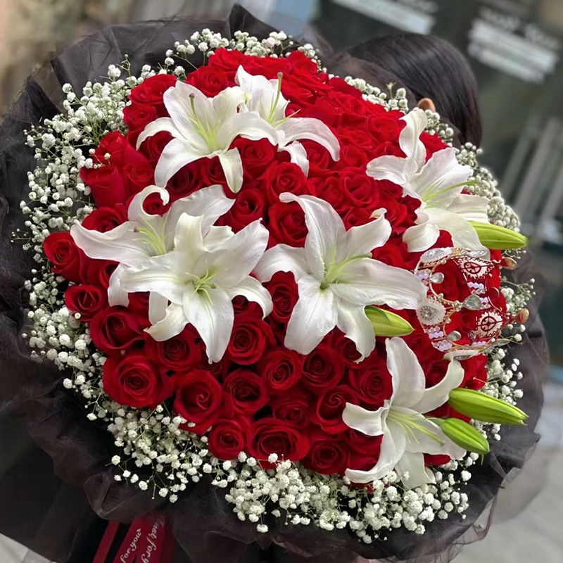 花 材:99朵卡罗拉红玫瑰,5枝多头白色香水百合,1个皇冠,满天星围边点缀。