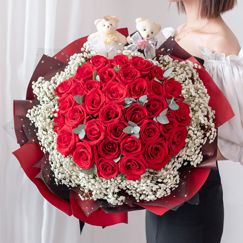 花很漂亮,也很新鲜,闻着好香啊,她很喜欢,谢谢老板这么准时的送到了,下次还来买,33朵玫瑰挺大的,很满意的一次购物,再次感谢老板