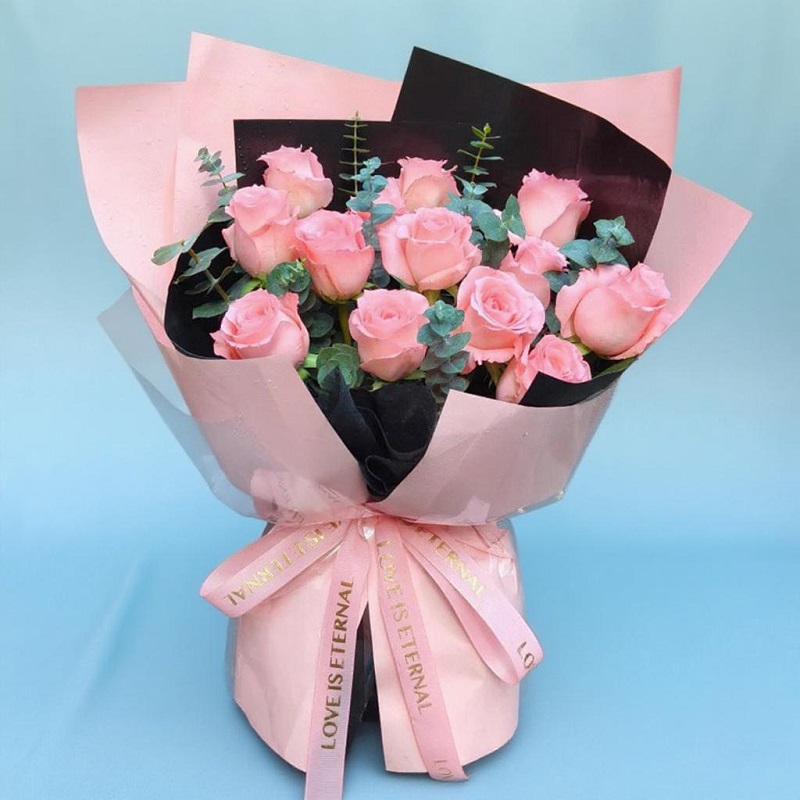 - 花材11朵粉玫瑰,搭配尤加利叶装饰。